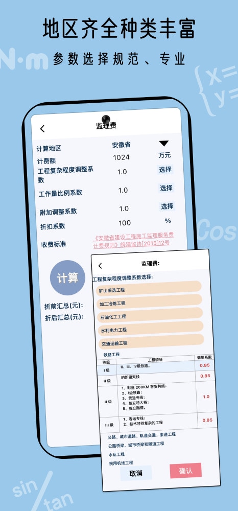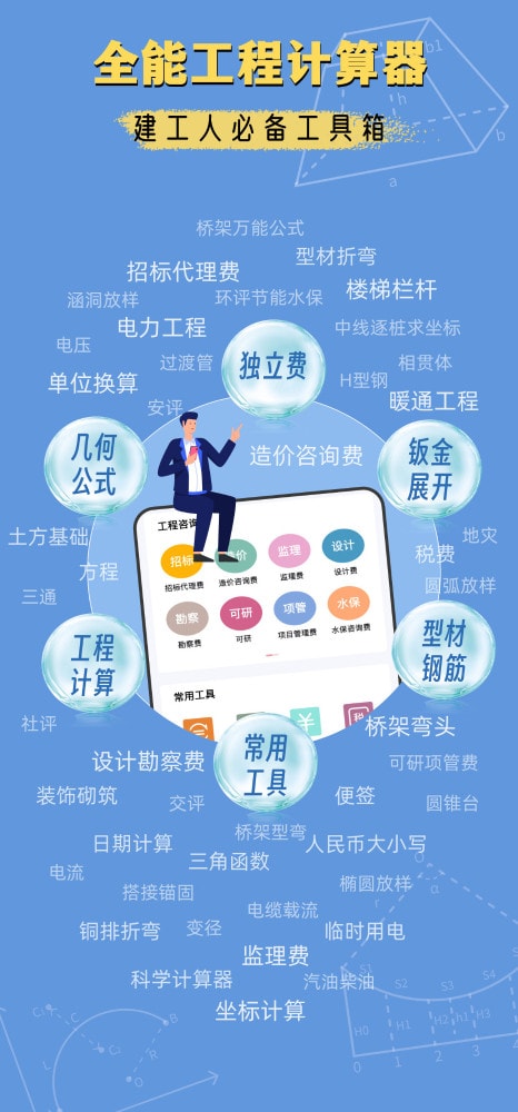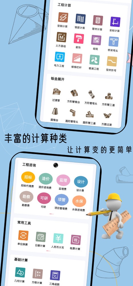 欢迎您使用“建工算料计算器”,这是一款建筑工程行业各类专业建工计算器和效率算料工具。工程咨询:招标代理费、监理费、设计勘察、造价咨询、可研项管、水保环评等独立费;工程计算器:手机钣金展开、型钢、钢筋、管材、坐标、交会定点、土方基础、混凝土、沥青路面、电工计算器、桥架弯头、楼梯栏杆、暖通工程、型材折弯、装饰砌筑、涵洞放样、八字墙、桥墩体积、脚手架用料计算等;基础计算:几何、方程、椭圆放样、圆弧放样;效率工具:日期计算、单位转换、科学计算器、税费计算、直尺、法律法规、便签;计算过程可导出,历史可查询。集建筑建工、电工、木工、车工管道、放样、算料、下料、材料重量、独立费于一体的全能计算器。「原招投标工具箱」。